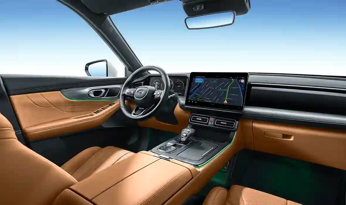 Качество материалов отделки салона и уровень оснащения автомобиля полностью соответствует флагманскому статусу модели. Высококлассные материалы соседствуют с топовыми мультимедийными решениями и премиальными опциями. Интерфейс информационно-развлекательной системы обновленного GAC GS8  полностью русифицирован и поддерживает протоколы Apple CarPlay и Android Auto, а также онлайн-сервисы VK.